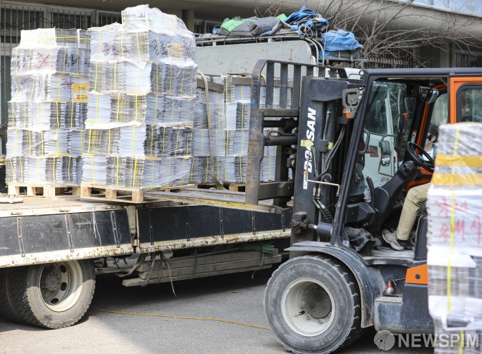 [서울=뉴스핌] 이한결 기자 = 제21대 국회의원선거(4.15 총선)의 공식 선거운동 시작을 하루 앞둔 1일 오후 서울 종로구선거관리위원회에서 관계자들이 제출된 후보자들의 선거 공보물을 옮기고 있다. 2020.04.01 alwaysame@newspim.com