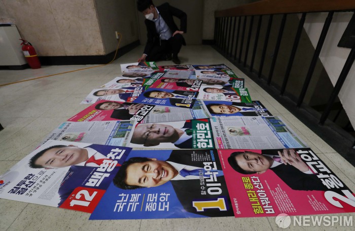 [서울=뉴스핌] 이한결 기자 = 제21대 국회의원선거(4.15 총선)의 공식 선거운동 시작을 하루 앞둔 1일 오후 서울 종로구선거관리위원회에서 관계자가 후보자들의 선거 벽보를 살펴보고 있다. 2020.04.01 alwaysame@newspim.com