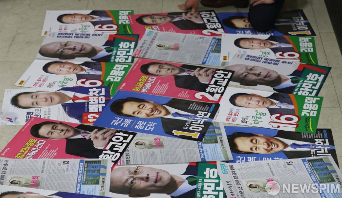 [서울=뉴스핌] 이한결 기자 = 제21대 국회의원선거(4.15 총선)의 공식 선거운동 시작을 하루 앞둔 1일 오후 서울 종로구선거관리위원회에서 관계자가 후보자들의 선거 벽보를 살펴보고 있다. 2020.04.01 alwaysame@newspim.com
