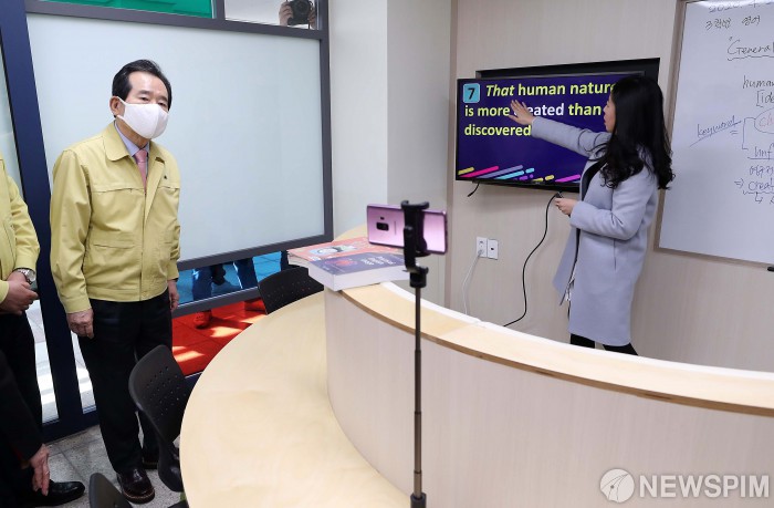 [인천=뉴스핌] 정일구 기자 = 정세균 국무총리가 2일 오후 신종 코로나바이러스 감염증(코로나19) 대응 원격교육 현장인 인천 서구 초은고등학교에서 원격수업을 참관하고 있다. 2020.04.02 mironj19@newspim.com
