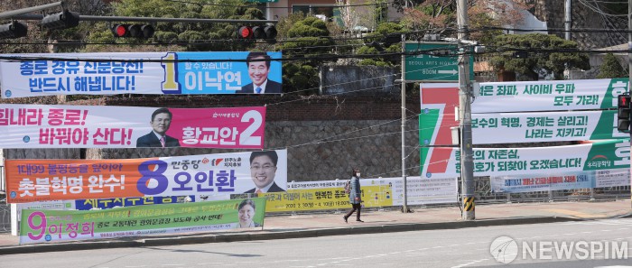 [서울=뉴스핌] 백인혁 기자 = 3일 오후 서울 종로구 홍지동 거리에 종로구에 출마하는 후보자들의 선거 현수막이 게시돼 있다. 2020.04.03 dlsgur9757@newspim.com