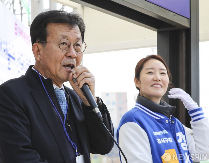 [서울=뉴스핌] 이한결 기자 = ‘라떼는! 유세단’ 단장 원혜영 의원이 3일 오후 서울 강서구 우장산역 인근에서 제21대 국회의원선거(4.15 총선) 강서갑에 출마하는 강선우 더불어민주당 후보의 거리 유세를 돕고 있다. 2020.04.03 alwaysame@newspim.com