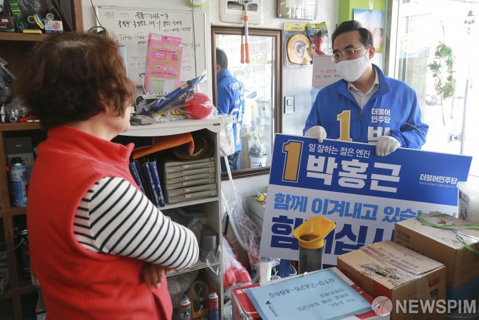 [서울=뉴스핌] 이형석 기자 = 제21대 국회의원선거 서울 중랑구을에 출마한 박홍근 더불어민주당 후보가 3일 오후 서울 중랑구 묵동지역 상가를 돌며 거리유세를 하고 있다. 2020.04.03 leehs@newspim.com