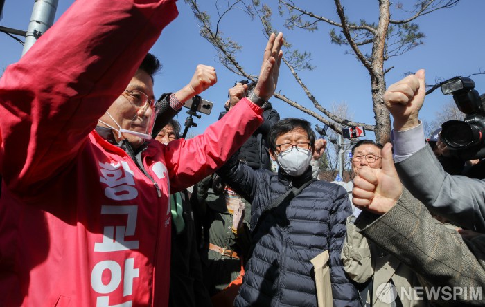 [서울=뉴스핌] 최상수 기자 = 황교안 미래통합당 종로구 후보가 4일 오후 서울 종로구 가회동 재동초등학교 앞 삼거리에서 선거 유세를 펼치고 있다. 2020.04.04 kilroy023@newspim.com