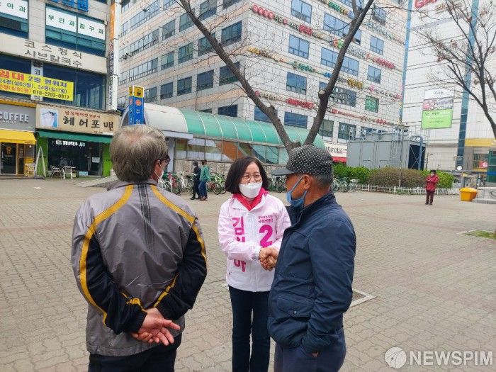 [서울=뉴스핌] 김태훈 기자 = 제21대 국회의원선거(4.15 총선) 김현아 미래통합당 고양정 후보가 주엽역 인근에서 시민들과 인사를 나누고 있다. 2020.04.07 taehun02@newspim.com