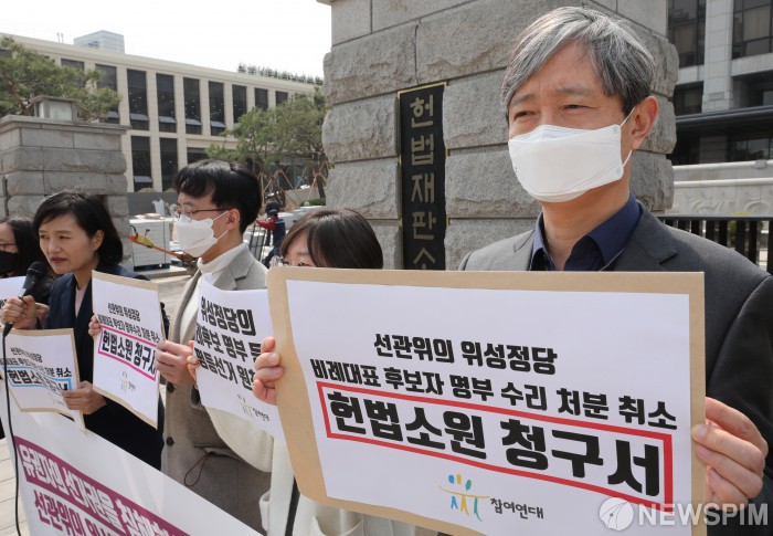 [서울=뉴스핌] 백인혁 기자 = 참여연대 회원들이 7일 오후 서울 종로구 헌법재판소 앞에서 선관위의 위성정당 비례명부 수리 처분 취소 헌법소원 청구 기자브리핑을 하고 있다. 이날 참여연대는 기자브리핑 직후 헌법재판소에 두 당의 비례대표 국회의원 후보자 명부 등록 수리 처분을 취소하는 결정을 신속하게 내려줄 것을 촉구하며 헌법소원심판청구서를 제출했다. 2020.04.07 dlsgur9757@newspim.com