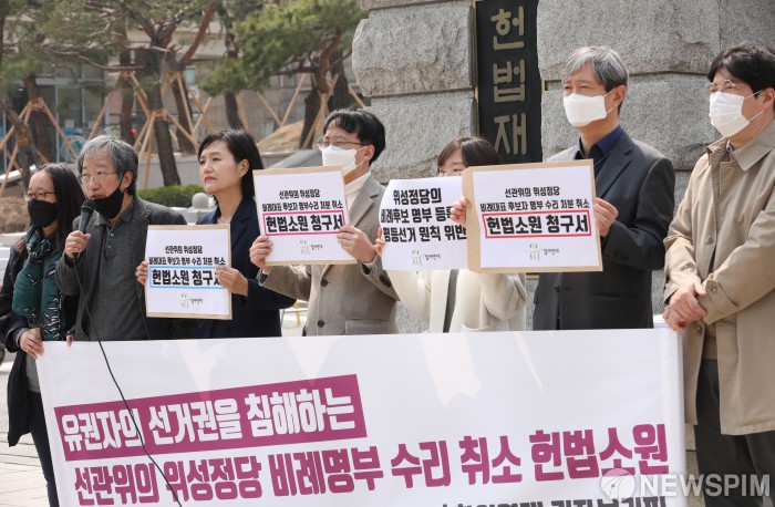[서울=뉴스핌] 백인혁 기자 = 참여연대 회원들이 7일 오후 서울 종로구 헌법재판소 앞에서 선관위의 위성정당 비례명부 수리 처분 취소 헌법소원 청구 기자브리핑을 하고 있다. 이날 참여연대는 기자브리핑 직후 헌법재판소에 두 당의 비례대표 국회의원 후보자 명부 등록 수리 처분을 취소하는 결정을 신속하게 내려줄 것을 촉구하며 헌법소원심판청구서를 제출했다. 2020.04.07 dlsgur9757@newspim.com