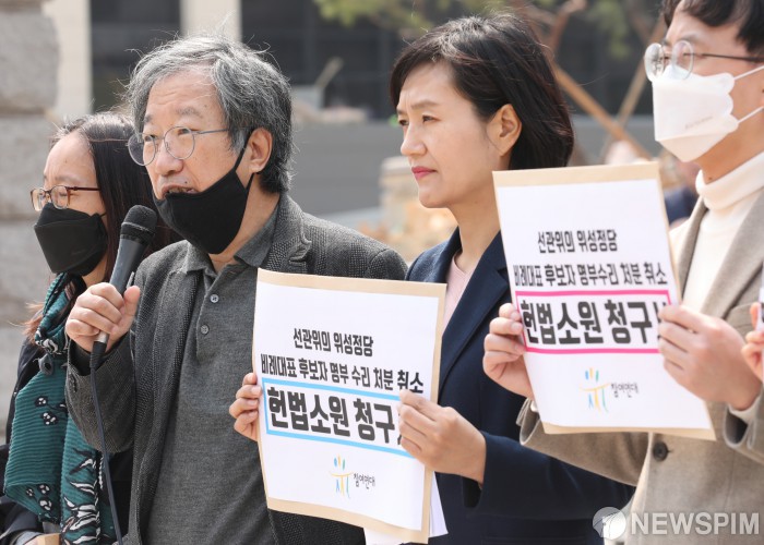 [서울=뉴스핌] 백인혁 기자 = 참여연대 회원들이 7일 오후 서울 종로구 헌법재판소 앞에서 선관위의 위성정당 비례명부 수리 처분 취소 헌법소원 청구 기자브리핑을 하고 있다. 이날 참여연대는 기자브리핑 직후 헌법재판소에 두 당의 비례대표 국회의원 후보자 명부 등록 수리 처분을 취소하는 결정을 신속하게 내려줄 것을 촉구하며 헌법소원심판청구서를 제출했다. 2020.04.07 dlsgur9757@newspim.com