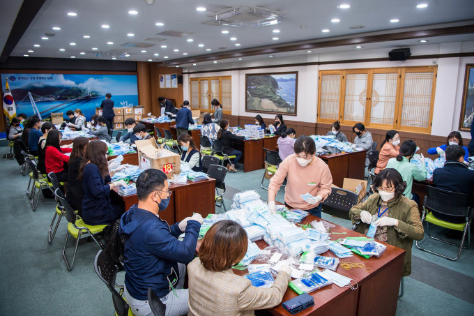 | 일회용 마스크를 포장하고 있는 남해군청 직원들[사진=남해군] 2020.04.07 |