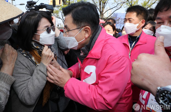 [서울=뉴스핌] 백인혁 기자 = 황교안 미래통합당 종로구 후보가 7일 오후 서울 종로구 동묘시장 앞에서 선거 유세를 마치고 이동하며 유권자들과 대화하고 있다. 2020.04.07 dlsgur9757@newspim.com