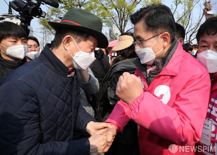 [서울=뉴스핌] 백인혁 기자 = 황교안 미래통합당 종로구 후보가 7일 오후 서울 종로구 동묘시장 앞에서 선거 유세를 마치고 이동하며 유권자들과 대화하고 있다. 2020.04.07 dlsgur9757@newspim.com
