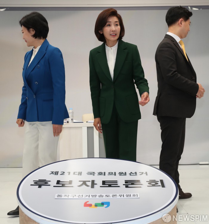 [서울=뉴스핌] 국회사진취재단 = 4.15 총선 서울 동작구을에 출마한 이수진(왼쪽부터) 더불어민주당, 나경원 미래통합당, 이호영 정의당 후보가 8일 오후 서울 서초구 반포대로 현대HCN 서초방송에서 열린 동작구선거방송토론위원회 주최 후보자 토론회에서 자리로 돌아가고 있다. 2020.04.08 photo@newspim.com