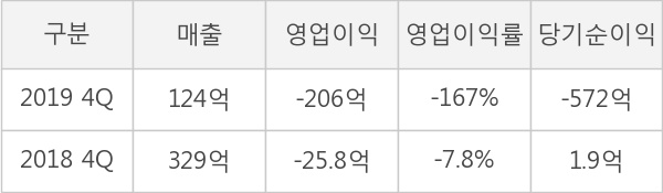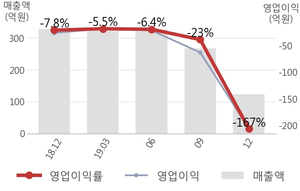 같은 기간, 매출은 199억(62%) 감소하였고 영업이익은 적자를 지속하였다.