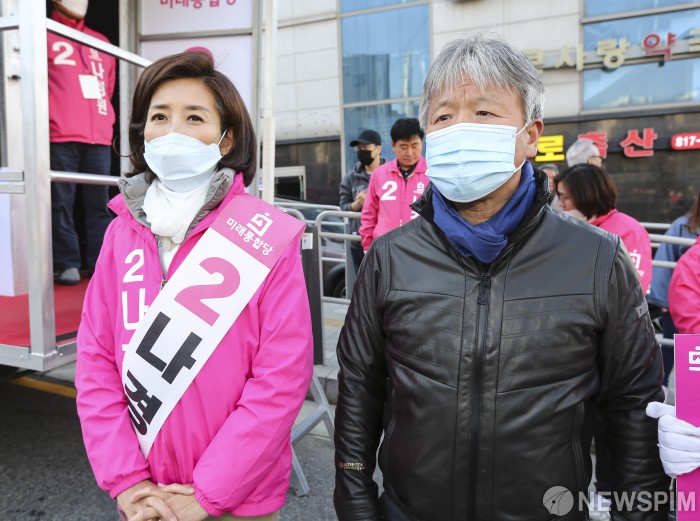 [서울=뉴스핌] 이한결 기자 = 제21대 국회의원선거(4.15 총선) 동작을 후보로 출마한 나경원 미래통합당 후보가 8일 오후 서울 동작구 숭실대입구역 인근 사거리에서 선거 지원에 나선 산악인 엄홍길 대장과 나란히 서있다. 2020.04.08 alwaysame@newspim.com