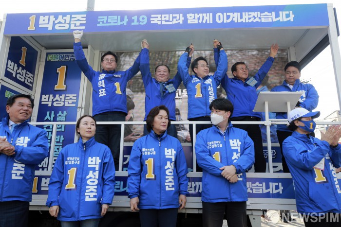 [서울=뉴스핌] 이형석 기자 = 제21대 국회의원선거 서울 중구성동구을에 출마한 박성준 더불어민주당 후보가 9일 오후 서울 성동구 금남시장에서 시민들에게 인사를 하고 있다. 왼쪽부터 홍익표 더불어민주당 후보, 강창일 의원, 박 후보, 원혜영 라떼는! 유세단장. 2020.04.09 leehs@newspim.com
