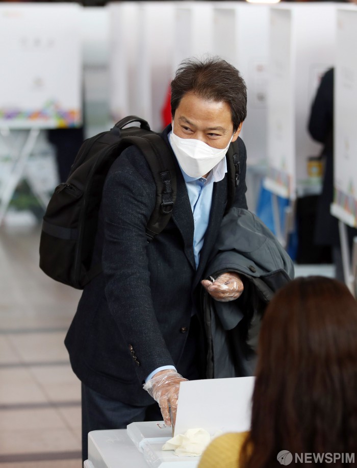 [서울=뉴스핌] 정일구 기자 = 임종석 전 청와대 비서실장이 제21대 국회의원 선거 사전투표 첫날인 10일 오전 서울 용산구 서울역에 마련된 남영동 사전투표소를 찾아 투표를 마친 후 투표함에 용지를 넣고 있다. 2020.04.10 mironj19@newspim.com