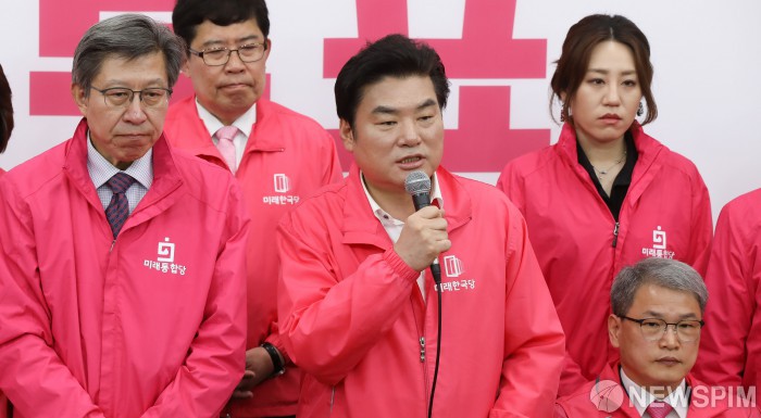[서울=뉴스핌] 최상수 기자 = 원유철 미래한국당 대표가 14일 오전 서울 여의도 국회에서 열린 미래통합당-미래한국당 '둘째칸 찍기' 캠페인 합동퍼포먼스에서 모두발언을 하고 있다. 2020.04.14 kilroy023@newspim.com