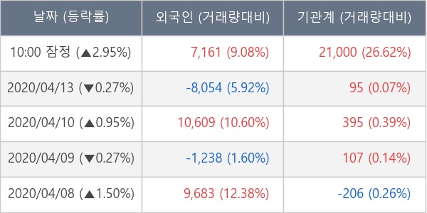 [서울=뉴스핌] 로보뉴스 = 14일 10시 15분 현재 이수화학(005950)은 기관이 21,000주 대량으로 순매수(잠정) 하면서 전일 대비 2.95% (현재가 7,670원) 상승하고 있다.