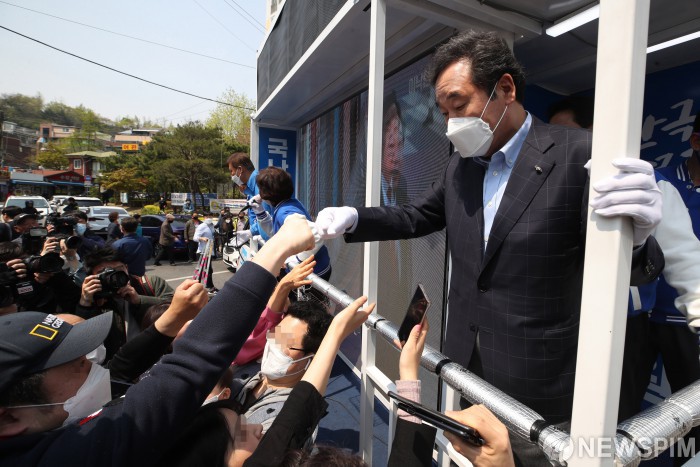[서울=뉴스핌] 백인혁 기자 = 제21대 국회의원 선거에서 종로구에 당선된 이낙연 후보가 16일 오후 서울 종로구 숭인동 일대에서 종로구민에게 감사의 인사를 전하고 있다. 2020.04.16 dlsgur9757@newspim.com
