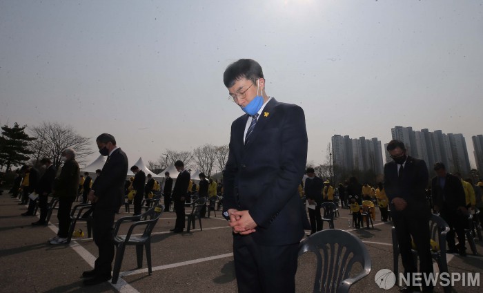 [안산=뉴스핌] 윤창빈 기자 = 김남국 경기 안산시 단원구을 당선자가 16일 오후 경기도 안산시 화랑유원지 제3주차장에서 열린 세월호참사 6주기 기억식에서 묵념을 하고 있다. 2020.04.16 pangbin@newspim.com