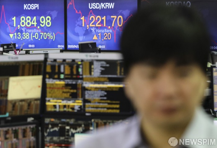 [서울=뉴스핌] 이한결 기자 = 미국 서부텍사스원유(WTI) 선물 가격이 사상 처음으로 0달러 이하로 폭락한 21일 오전 코스피 지수가 전 거래일 대비 11.58포인트(0.61%) 내린 1,886.78에 개장했다. 코스닥 지수는 3.06포인트(0.48%) 내린 634.77에 출발했고 달러/원 환율은 1.5원 오른 1,222.0원에 장을 시작했다. 이날 서울 중구 하나은행 딜링룸에서 딜러들이 업무를 보고 있다. 2020.04.21 alwaysame@newspim.com