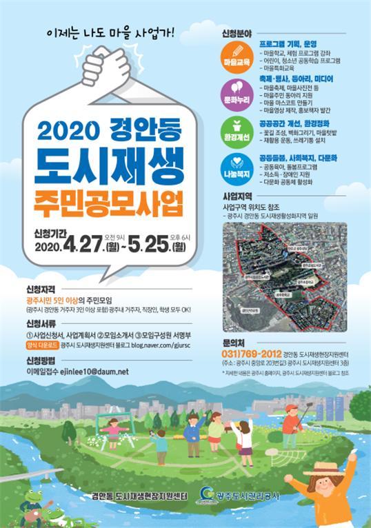| 기도 광주도시관리공사가 주민공동체 활성화 및 도시재생 방안을 모색하기 위해 '경안동, 송정동 도시재생 주민아이디어'를 공모한다.사진은 홍보 포스터.[사진=경기광주시] 2020.04.24 observer0021@newspim.com |