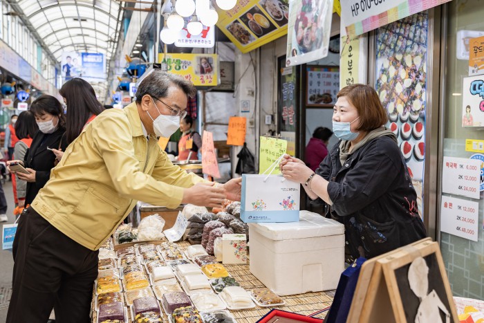 [서울=뉴스핌] = 김선갑 광진구청장이 27일 오후 서울 광진구 중곡제일골목시장을 찾아 코로나19 예방을 위해 상인들에게 ‘건강생활실천 자가 활동 꾸러미’를 전달하고 있다. [사진=광진구청] 2020.04.27 photo@newspim.com