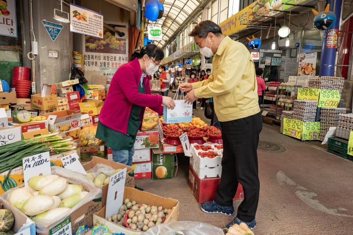[서울=뉴스핌] = 김선갑 광진구청장이 27일 오후 서울 광진구 중곡제일골목시장을 찾아 코로나19 예방을 위해 상인들에게 ‘건강생활실천 자가 활동 꾸러미’를 전달하고 있다. [사진=광진구청] 2020.04.27 photo@newspim.com