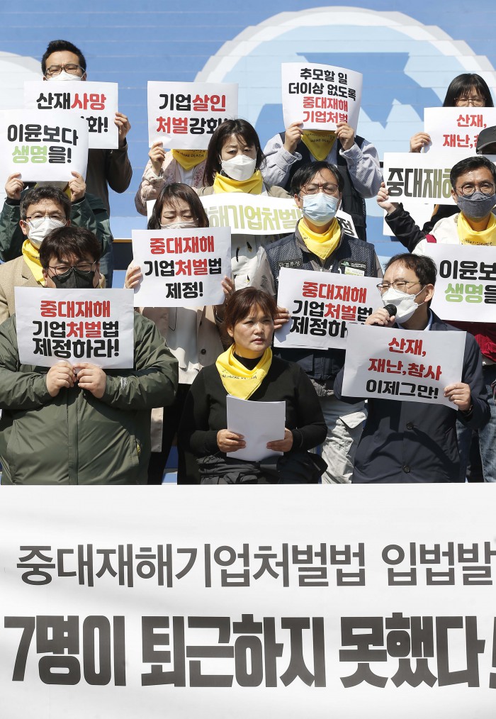 [서울=뉴스핌] 윤창빈 기자 = 28일 오전 서울 종로구 세종문화회관 앞에서 중대재해기업처벌법 입법발의자⋅입법발의 단체가 ‘중대재해기업처벌법 입법발의 운동 선포 기자회견’을 개최하고 피켓을 들고 있다. 2020.04.28 pangbin@newspim.com