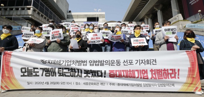 [서울=뉴스핌] 윤창빈 기자 = 28일 오전 서울 종로구 세종문화회관 앞에서 중대재해기업처벌법 입법발의자⋅입법발의 단체가 ‘중대재해기업처벌법 입법발의 운동 선포 기자회견’을 개최하고 피켓을 들고 있다. 2020.04.28 pangbin@newspim.com