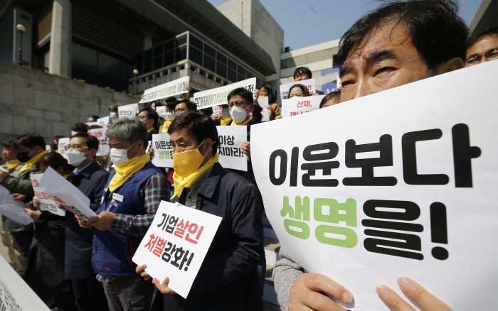 [서울=뉴스핌] 윤창빈 기자 = 28일 오전 서울 종로구 세종문화회관 앞에서 중대재해기업처벌법 입법발의자⋅입법발의 단체가 ‘중대재해기업처벌법 입법발의 운동 선포 기자회견’을 개최하고 피켓을 들고 있다. 2020.04.28 pangbin@newspim.com