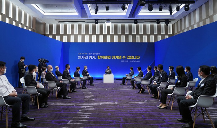 [서울=뉴스핌] 문재인 대통령이 29일 오전 서울 광진구 워커힐 호텔에서 열린 '코로나19 극복 고용유지 현장 간담회'에서 모두발언을 하고 있다. [사진=청와대] 2020.4.29 photo@newspim.com