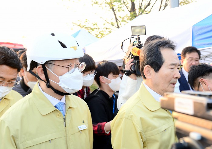 [이천=뉴스핌] 정종일 기자 = 29일 오후 화재가 발생한 경기도 이천시 모가면 소재 물류센터 화재현장에서 정세균 국무총리와 이재명 경기도자사가 현장 브리핑을 받고 있다. 2020.04.29 observer0021@newspim.com