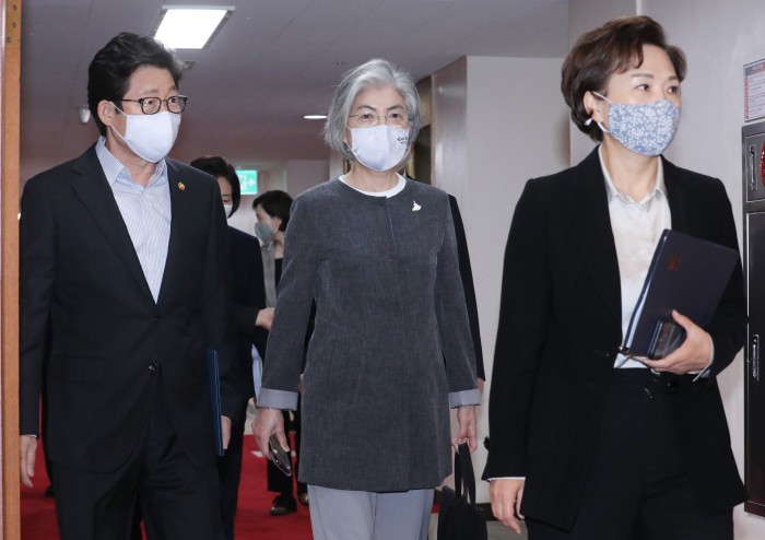 [서울=뉴스핌] 백인혁 기자 = 왼쪽부터 조명래 환경부 장관, 강경화 외교부 장관, 김현미 국토교통부 장관이 1일 오전 서울 종로구 정부서울청사에서 열린 임시 국무회의에 참석하고 있다. 2020.05.01 dlsgur9757@newspim.com
