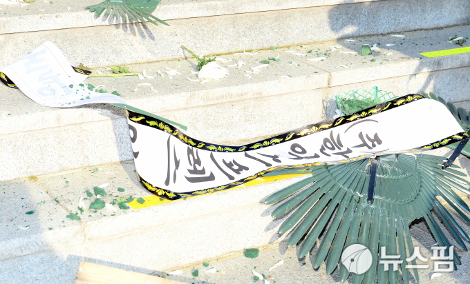 | [이천=뉴스핌] 정종일 기자 = 38명의 생명을 앗아간 경기도 이천 한익스프레스 물류센터 화재 희생자 유가족들이 4일 오후 5시 합동분향소 계단에서 기자회견을 하던 중 한익스프레스에서 보내온 조화가 계단에서 부서진채 널브러져 있다. 2020.05.04 observer0021@newspim.com |