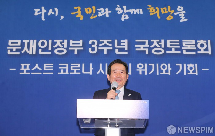 [서울=뉴스핌] 윤창빈 기자 = 정세균 국무총리가 8일 오후 서울 서초구 더케이호텔에서 열린 문재인정부 3주년 국정토론회에서 ‘코로나19, 국민과의 동행 그리고 희망‘을 주제로 특별강연을 하고 있다. 2020.05.08 pangbin@newspim.com