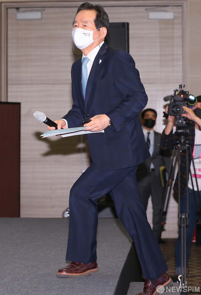 [서울=뉴스핌] 윤창빈 기자 = 정세균 국무총리가 8일 오후 서울 서초구 더케이호텔에서 열린 문재인정부 3주년 국정토론회에서 ‘코로나19, 국민과의 동행 그리고 희망‘을 주제로 특별강연을 하기 위해 연단에 오르고 있다. 2020.05.08 pangbin@newspim.com
