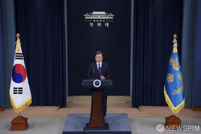 [서울=뉴스핌] 문재인 대통령이 10일 오전 청와대에서 대통령 취임 3주년 특별연설을 하고 있다. [사진=청와대] 2020.05.10 photo@newspim.com