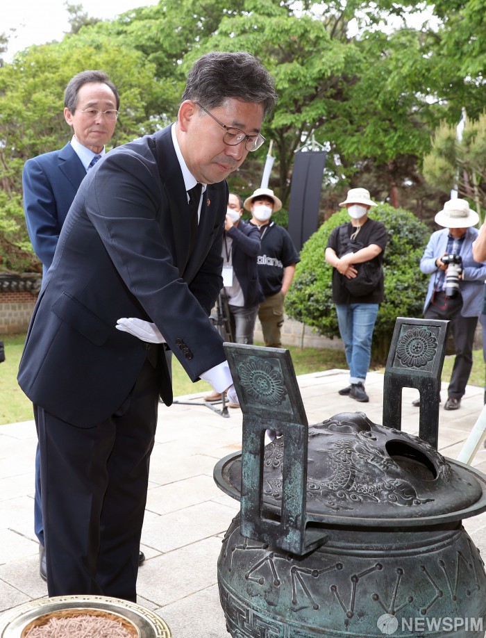[서울=뉴스핌] 이현경 기자 = 박양우 문화체육관광부 장관이 11일 전북 정읍 황토현 전적에서 ‘녹두의 함성, 새 하늘을 열다’를 주제로 열린 제126주년 동학농민혁명 기념식에 참석해 분향을 하고 있다. [사진=문체부] 2020.05.11 89hklee@newspim.com