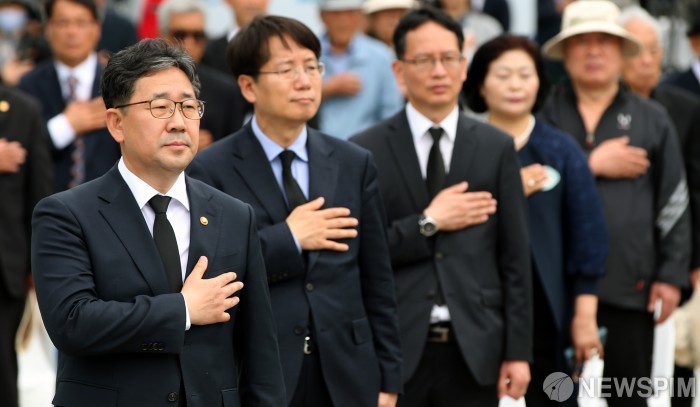 [서울=뉴스핌] 이현경 기자 = 박양우 문화체육관광부 장관이 11일 전북 정읍 황토현 전적에서 ‘녹두의 함성, 새 하늘을 열다’를 주제로 열린 제126주년 동학농민혁명 기념식에 참석해 국민의례를 하고 있다. [사진=문체부] 2020.05.11 89hklee@newspim.com