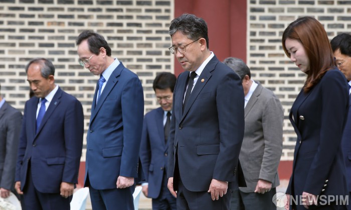 [서울=뉴스핌] 이현경 기자 = 박양우 문화체육관광부 장관이 11일 전북 정읍 황토현 전적에서 ‘녹두의 함성, 새 하늘을 열다’를 주제로 열린 제126주년 동학농민혁명 기념식에 참석해 묵념을 하고 있다. [사진=문체부] 2020.05.11 89hklee@newspim.com