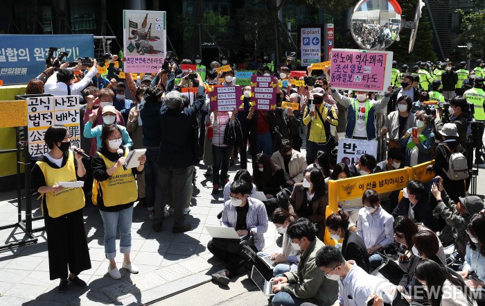 [서울=뉴스핌] 정일구 기자 = 13일 오후 서울 종로구 옛 일본대사관 앞에서 열린 '제1439차 일본군 성노예제 문제해결을 위한 정기 수요시위가 온라인 생중계로 진행되고 있다. 2020.05.13 mironj19@newspim.com