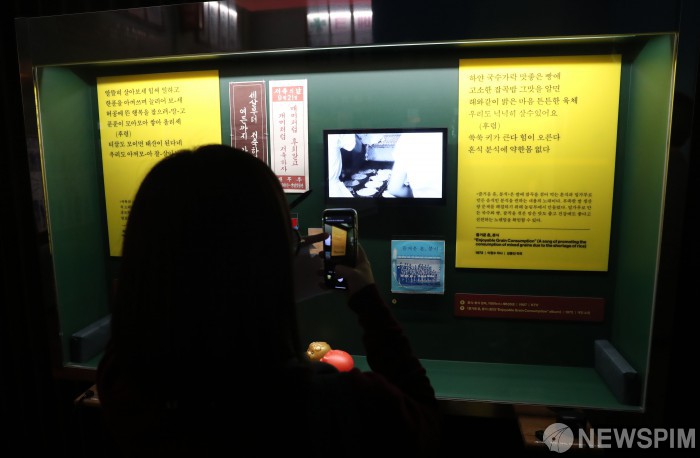 [서울=뉴스핌] 김학선 기자 = 국립한국박물관이 2020 기획특별전 <노랫말-선율에 삶을 싣다>를 오는 15일부터 10월 18일까지 개최한다. 전시에서는 선율을 타고 우리 삶을 실어 나른 대중가요 노랫말의 발자취와 노랫말에 담긴 우리말과 글의 묘미를 소개한다. 전시 오픈을 하루 앞둔 14일 서울 용산구 국립한글박물관에서 열린 언론간담회가 끝나고 취재진이 전시장을 둘러보고 있다. 2020.05.14 yooksa@newspim.com