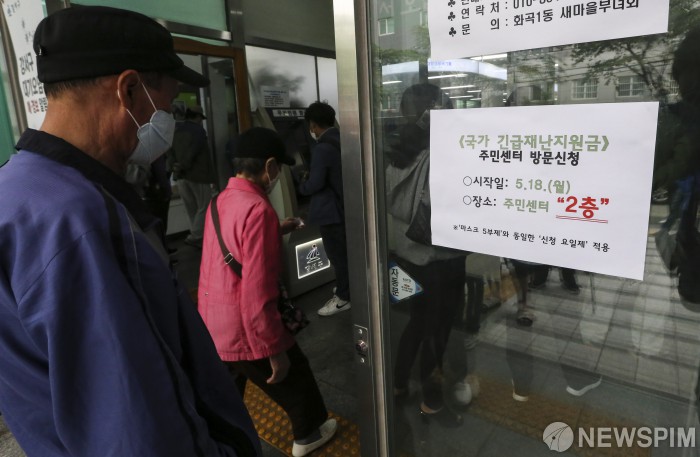 [서울=뉴스핌] 이한결 기자 = 정부 긴급재난지원금 현장 신청이 시작된 18일 오전 서울 강서구 화곡1동 주민센터에서 시민들이 접수를 하기 위해 줄을 서고 있다. 11일부터 온라인으로 신청 가능했던 정부 긴급재난지원금이 오늘부터는 각 지자체 행정복지센터와 전국 14개 은행 6500여개 영업점에서 신청 가능하다. 5부제 시행으로 월요일인 18일은 출생연도 끝자리가 1, 6인 세대주가 신청할 수 있다. 2020.05.18 alwaysame@newspim.com