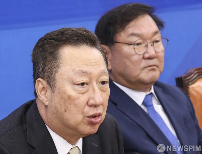 [서울=뉴스핌] 이한결 기자 = 박용만 대한상공회의소(대한상의) 회장이 19일 오전 서울 여의도 국회에서 김태년 더불어민주당 원내대표를 예방해 인사말을 하고 있다. 2020.05.19 alwaysame@newspim.com