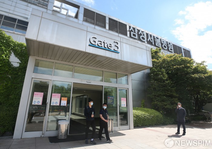 [서울=뉴스핌] 윤창빈 기자 = 19일 오후 서울 강남구 삼성서울병원에서 관계자들이 출입을 하고 있다. 이날 삼성서울병원에서 간호사 4명이 코로나19 확진판정을 받았다. 삼성서울병원은 ‘본관 3층 수술실 일부와 탈의실 등을 임시폐쇄하고, 긴급방역을 실시했다‘고 밝혔다. 국내 주요 대형 병원 의료진이 코로나19로 확진된건 이번이 처음이다. 2020.05.19 pangbin@newspim.com