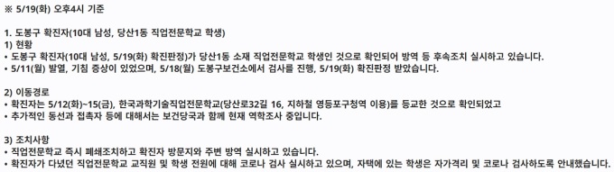 도봉구 10번 확진자는 이태원 클럽에서 감염된 관악구 확진자의 지인이다. 따라서 한국과학기술직업전문학교 확진자 역시 이태원 클럽 사태에 4차 감염으로 파악된다.