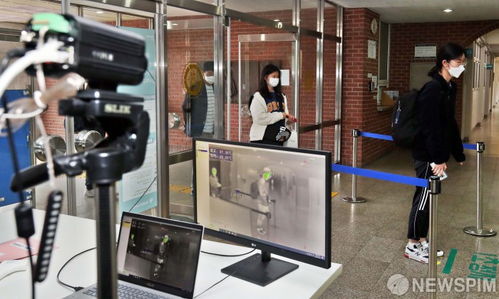 [서울=뉴스핌] 윤창빈 기자 = 신종 코로나바이러스 감염증(코로나19) 여파로 5차례나 연기됐던 개학이 시작된 20일 오전 서울 송파구 창덕여자고등학교에서 고3 학생들이 등교를 하며 체온을 재고 있다. 2020.05.20 pangbin@newspim.com