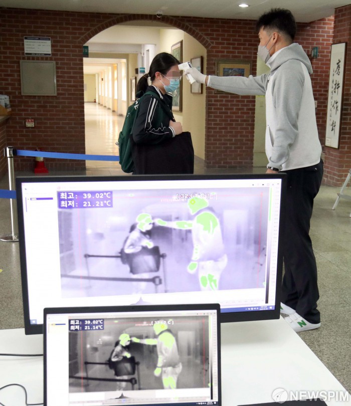 [서울=뉴스핌] 윤창빈 기자 = 신종 코로나바이러스 감염증(코로나19) 여파로 5차례나 연기됐던 개학이 시작된 20일 오전 서울 송파구 창덕여자고등학교에서 고3 학생들이 등교를 하며 체온을 재고 있다. 2020.05.20 pangbin@newspim.com
