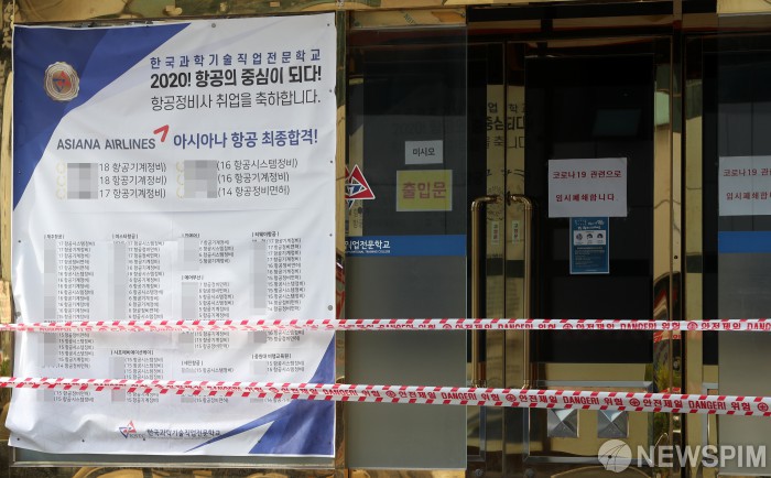 [서울=뉴스핌] 정일구 기자 = 20일 오전 재학생 중 신종 코로나바이러스 감염증(코로나19) 확진자가 나온 서울 영등포구 한국과학기술직업전문학교 입구에 임시 폐쇄 안내문이 붙어있다. 2020.05.20 mironj19@newspim.com